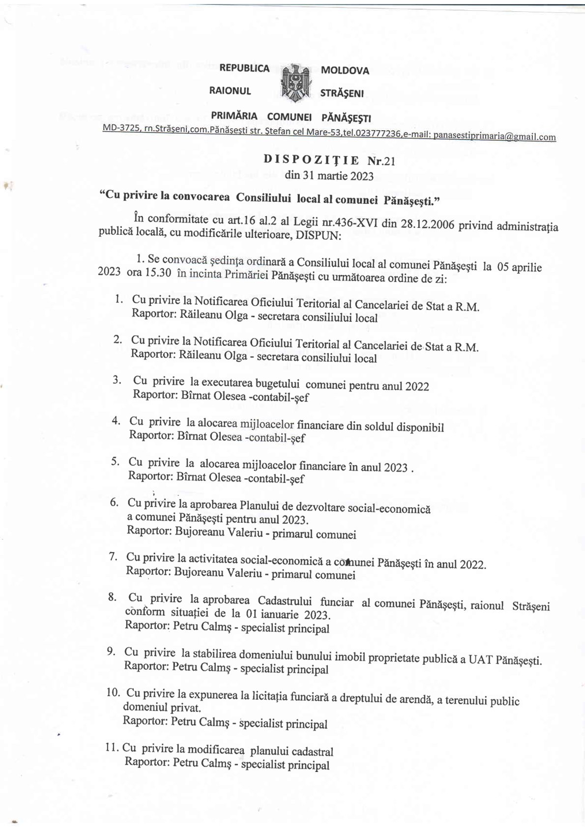 31 martie 2023 Cu privire la Convocarea Consiliului Comunal în ședință ordinară la 05.04.2023 ora 15.30 în incinta primăriei Pănășești