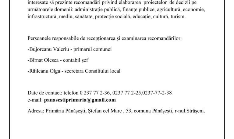 Anunț privind iniţierea procesului de elaborare a proiectelor de decizii ale Consiliului Local Pănășești. 11 ianuarie 2023Primăria PănășeștiComments (0)