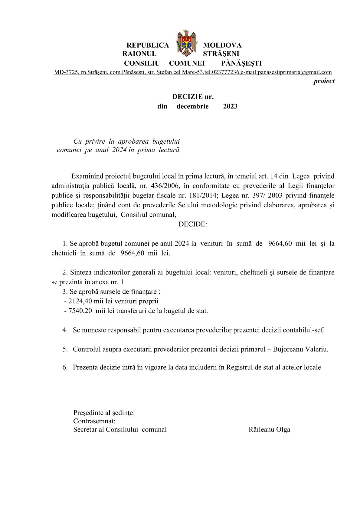 Cu privire la aprobarea bugetului comunei pe anul 2024 în prima lectură.