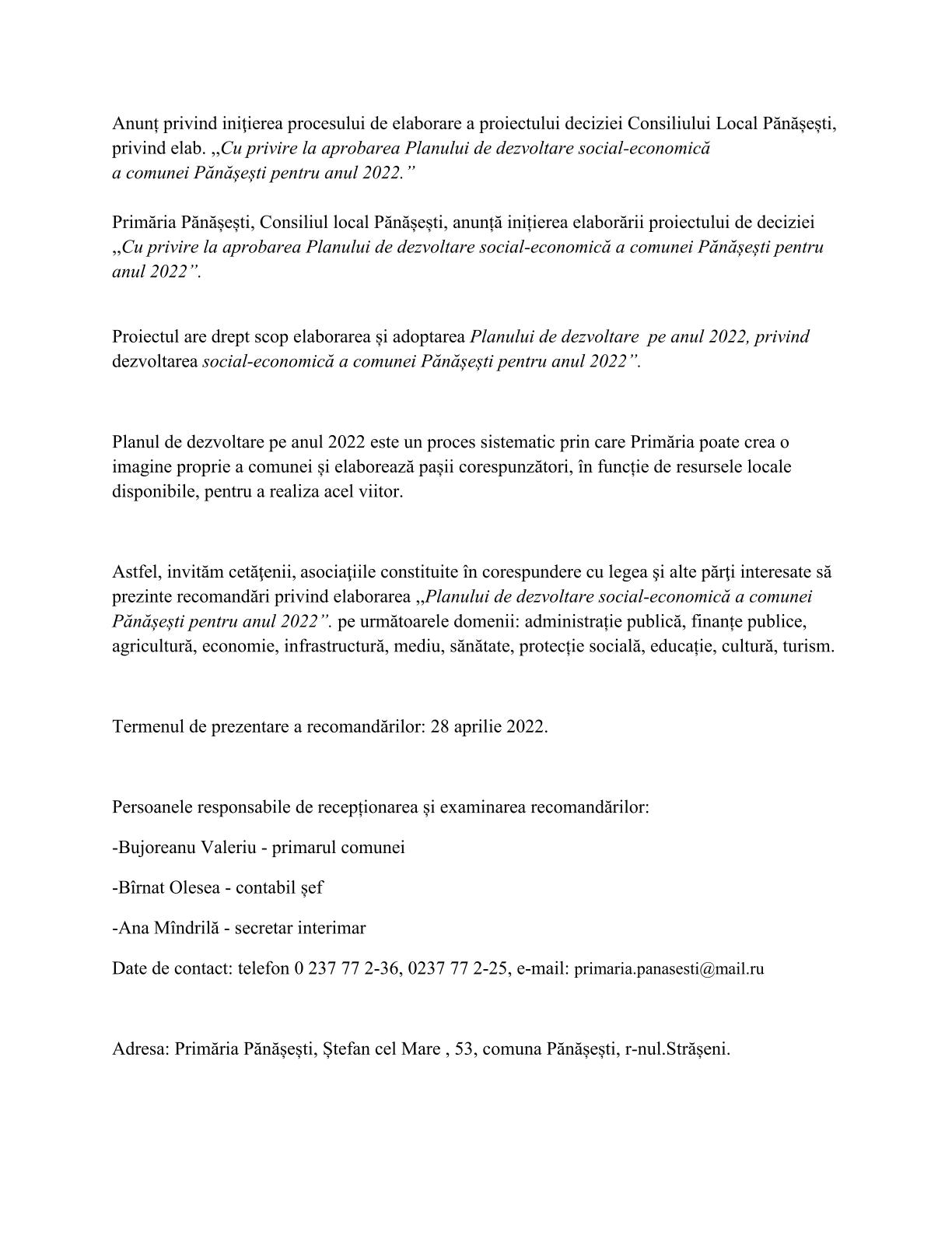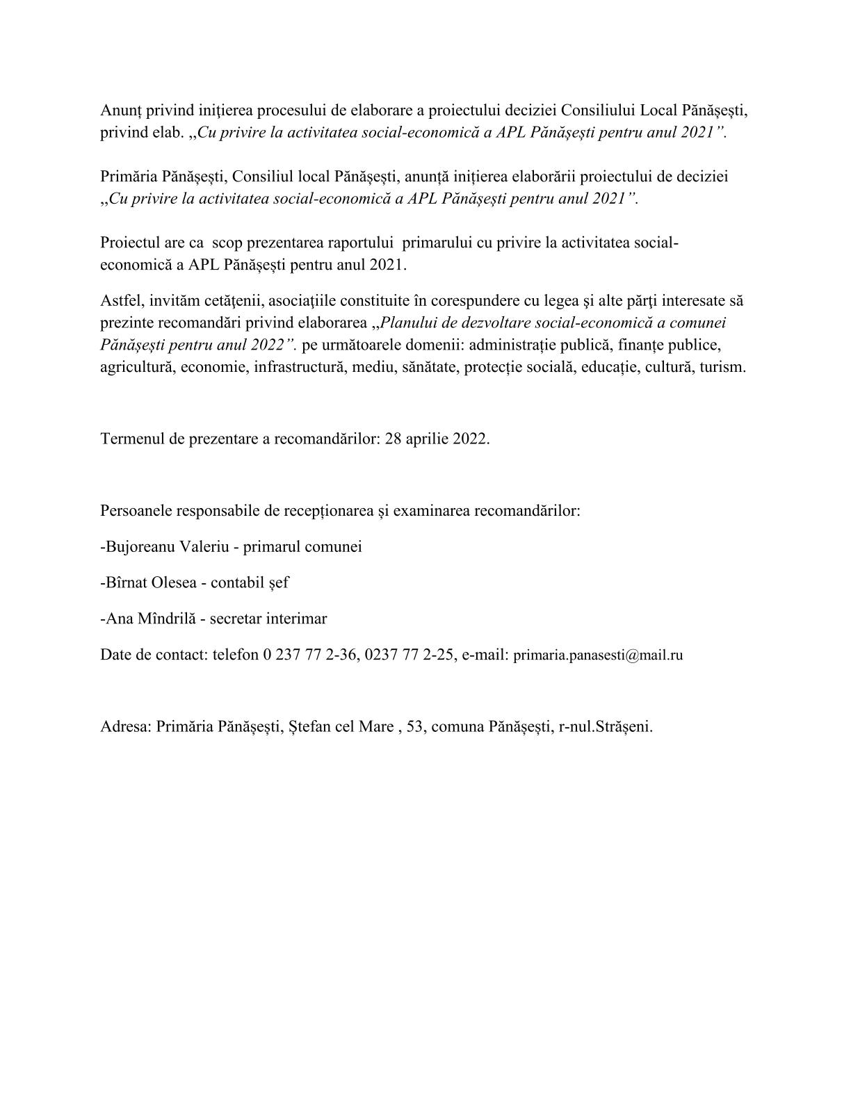 20 aprilie 2022 Anunț privind iniţierea procesului de elaborare a proiectului deciziei ,,Cu privire la activitatea social-economică a APL Pănășești pentru anul 2021”.