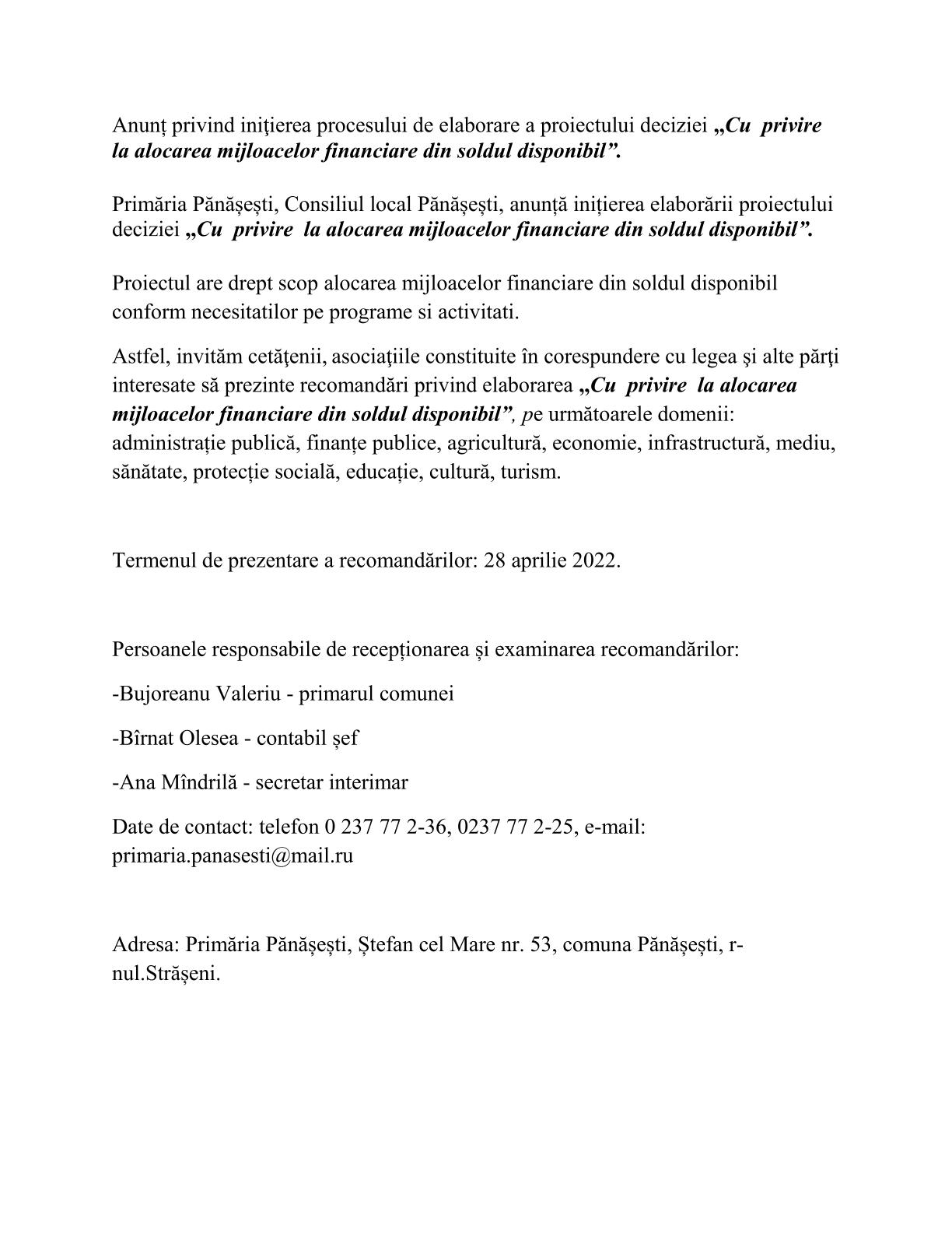 20 aprilie 2022 Anunț privind iniţierea procesului de elaborare a proiectului de decizie,,Cu privire la alocarea mijloacelor financiare din soldul disponibil”.