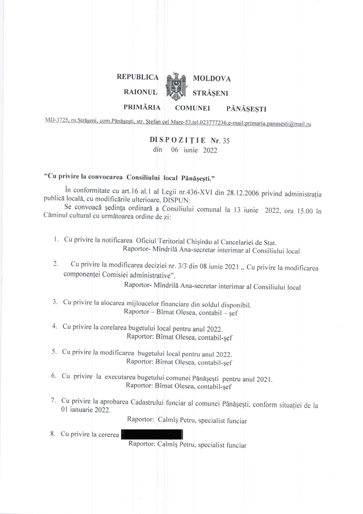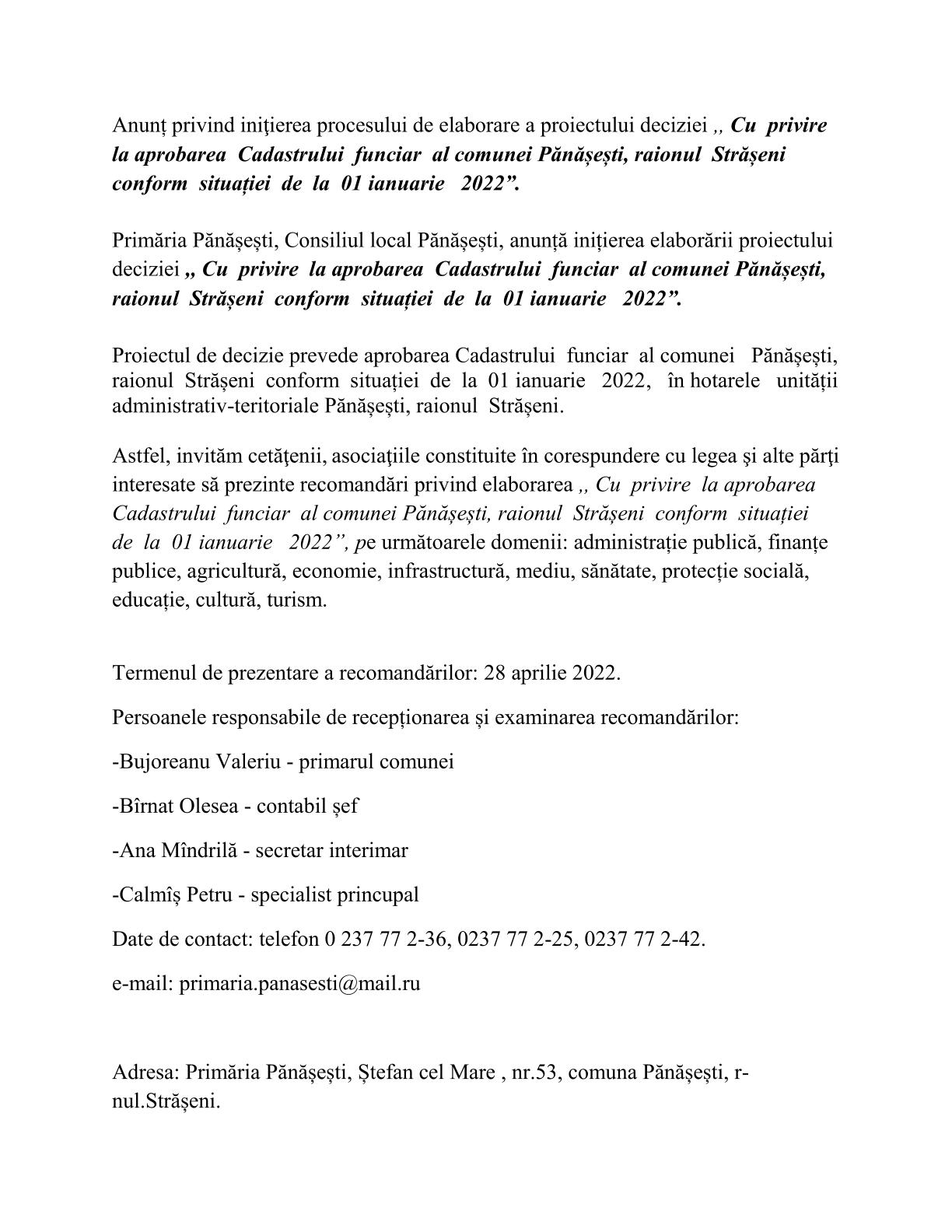 20 aprilie 2022 Anunț privind iniţierea procesului de elaborare a proiectului de decizie,, Cu privire la aprobarea Cadastrului funciar al comunei Pănășești, raionul Strășeni conform situației de la 01 ianuarie 2022”.