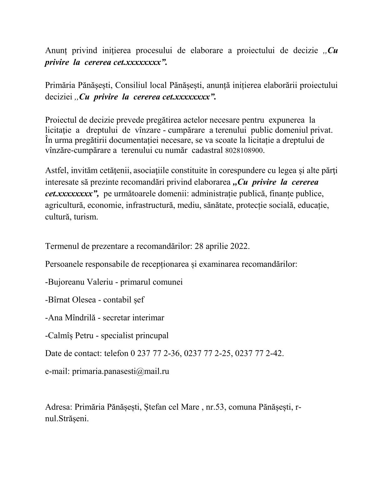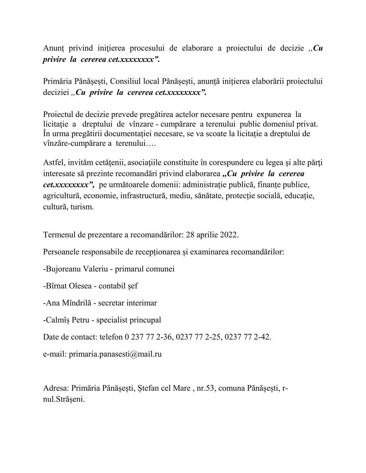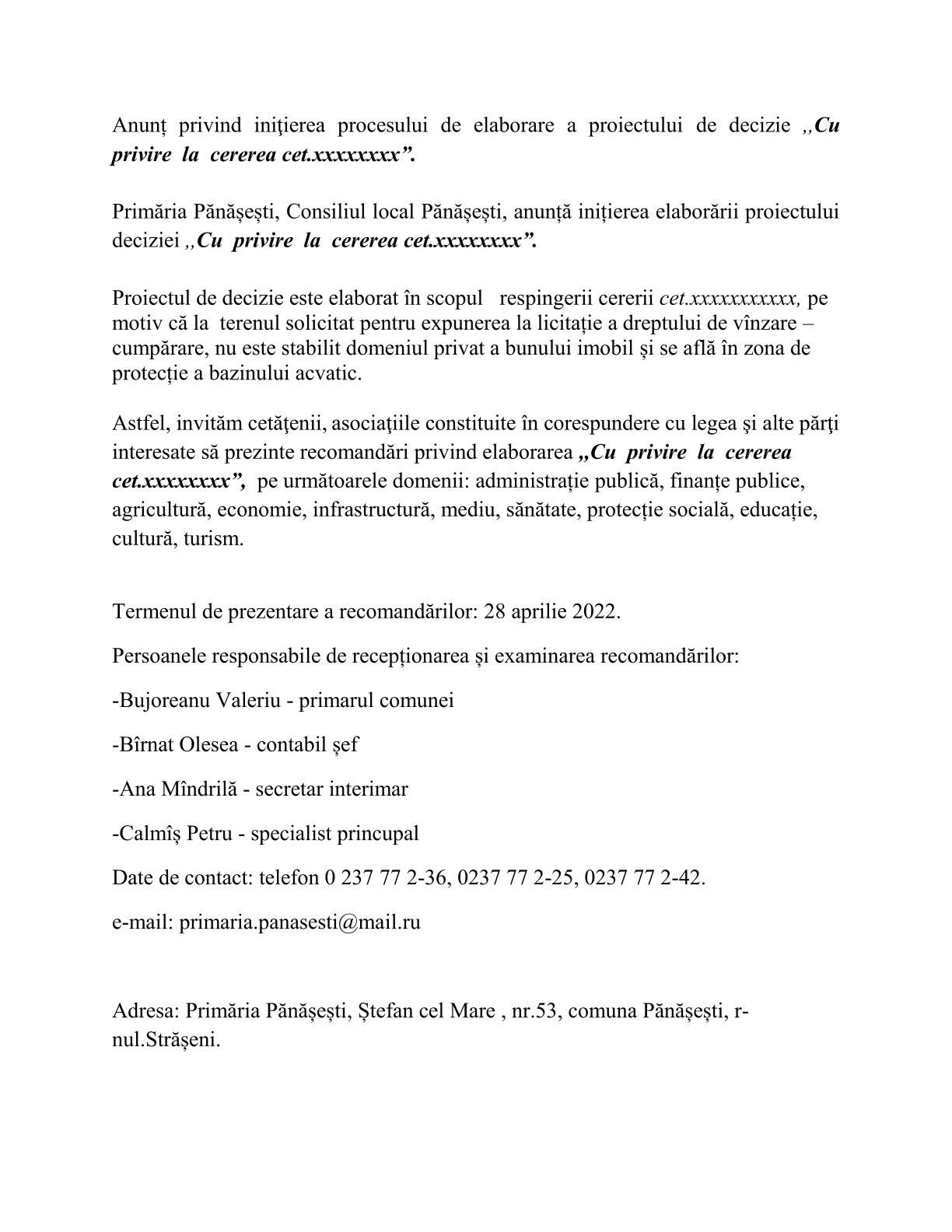 20 aprilie 2022 Anunț privind iniţierea procesului de elaborare a proiectului deciziei Cu privire la cererea cet.xxxxxxx”.