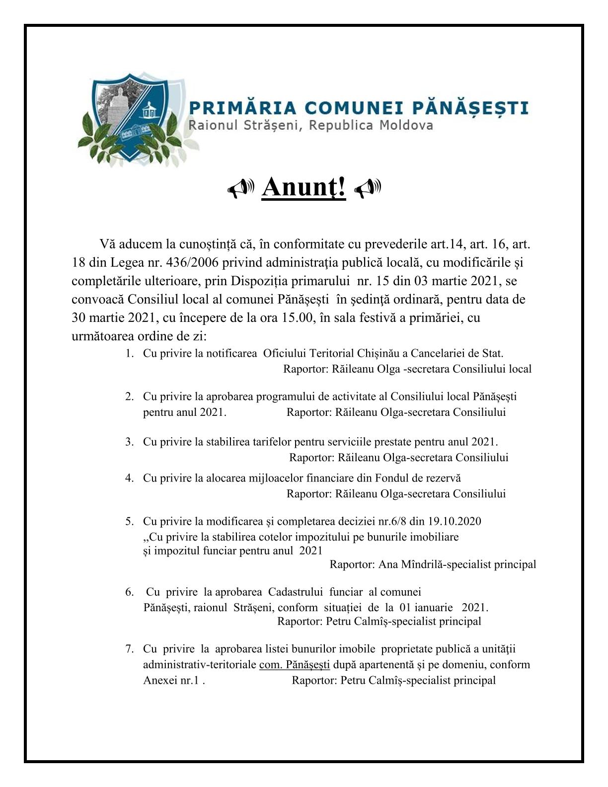 4 martie 2021 Consiliul comunei Pănășești se întrunește în ședință ordinară la data de 30 martie 2021.
