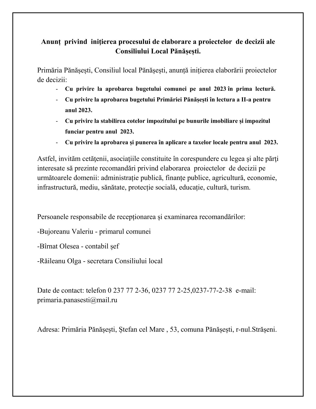 Consultări publice la proietele de decizii ,,Cu privire la aprobarea bugetului în lectura I și II pe anul 2023