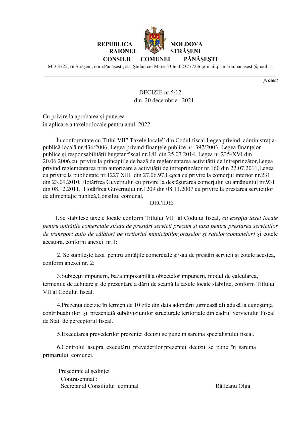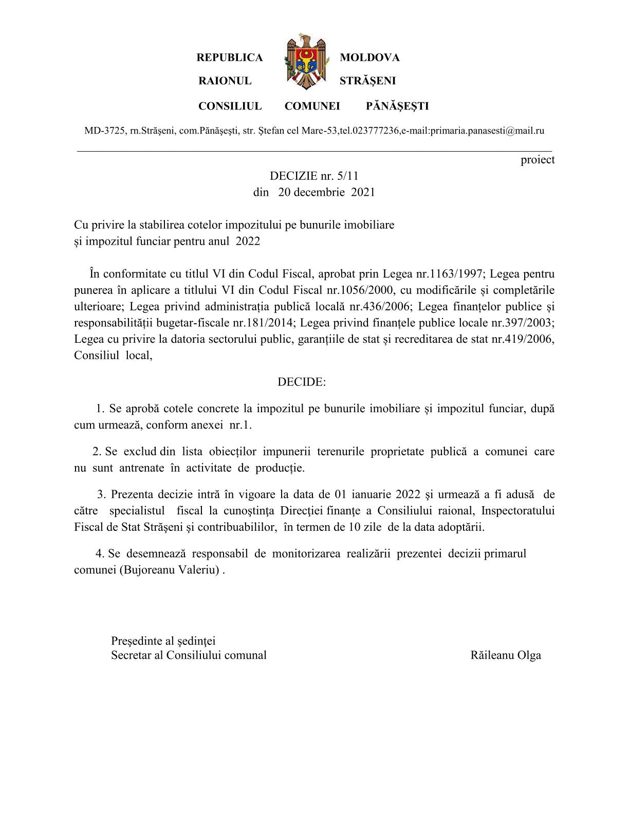 23 noiembrie 2021 Cu privire la stabilirea cotelor impozitului pe bunurile imobiliare și impozitul funciar pentru anul 2022