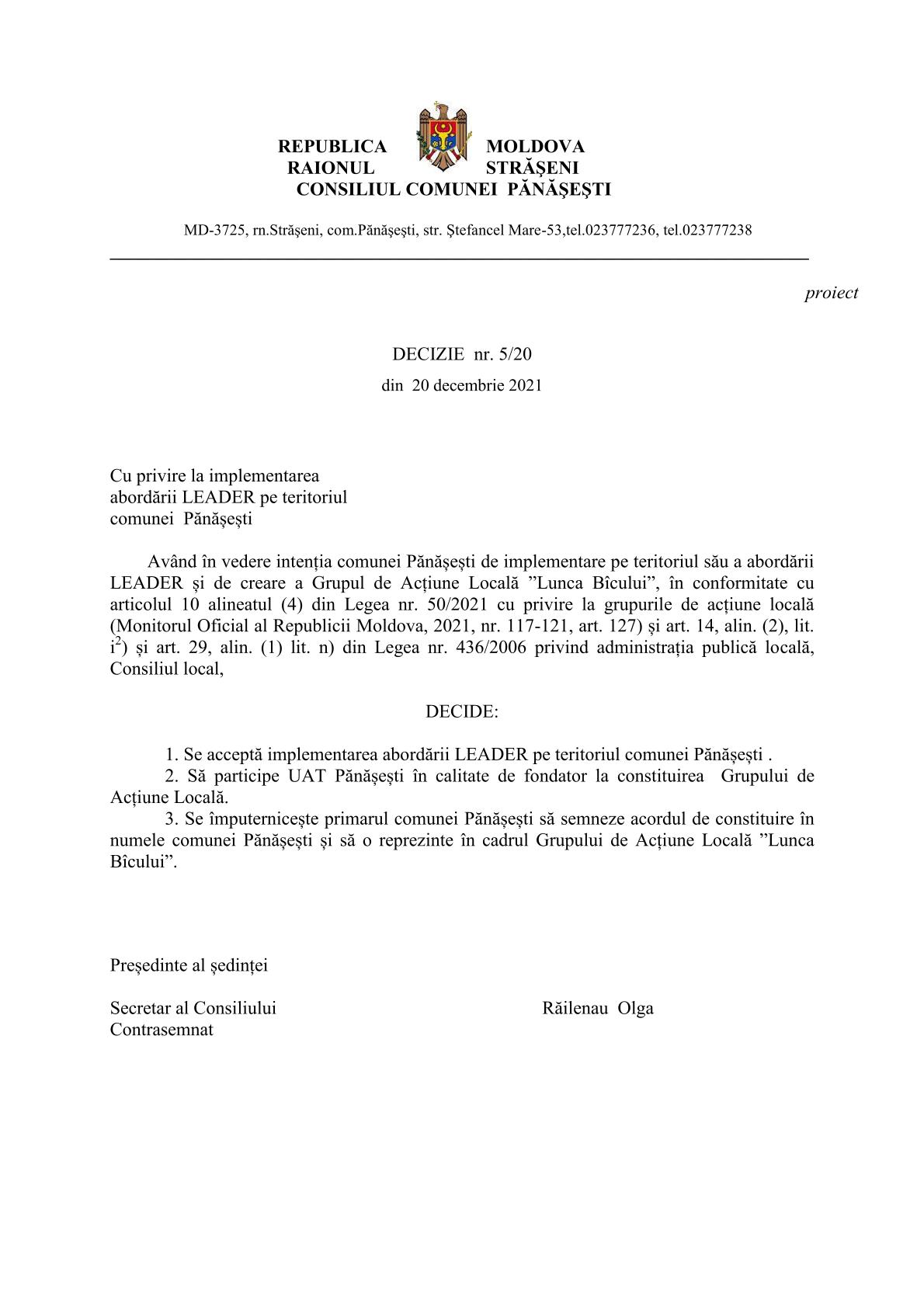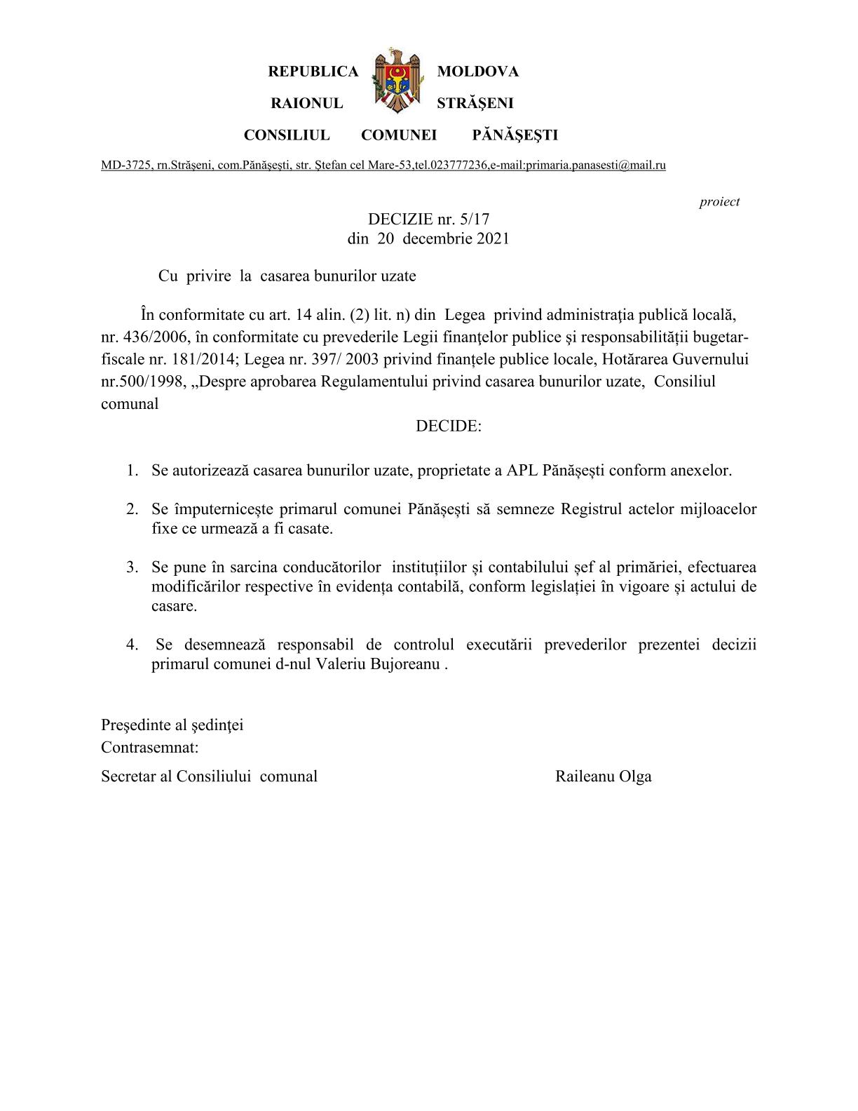 23 noiembrie 2021 Cu privire la modificarea planului cadastral, aprobarea planului geometric,declararea dreptului de proprietate a UAT Pănășești asupra surplusului de suprafață din domeniul privat.