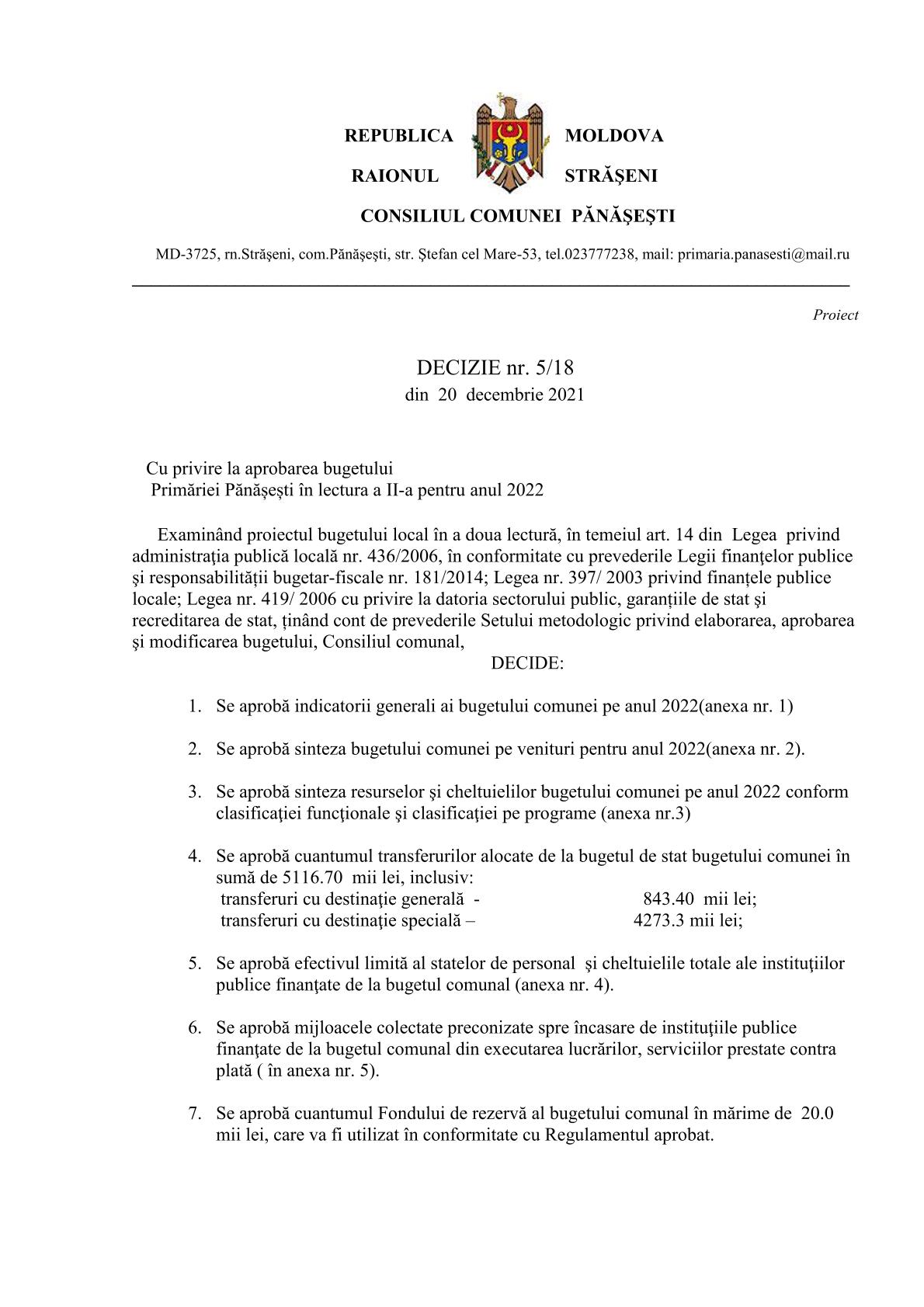 23 noiembrie 2021 Cu privire la aprobarea bugetului Primăriei Pănășești în lectura a II-a pentru anul 2022