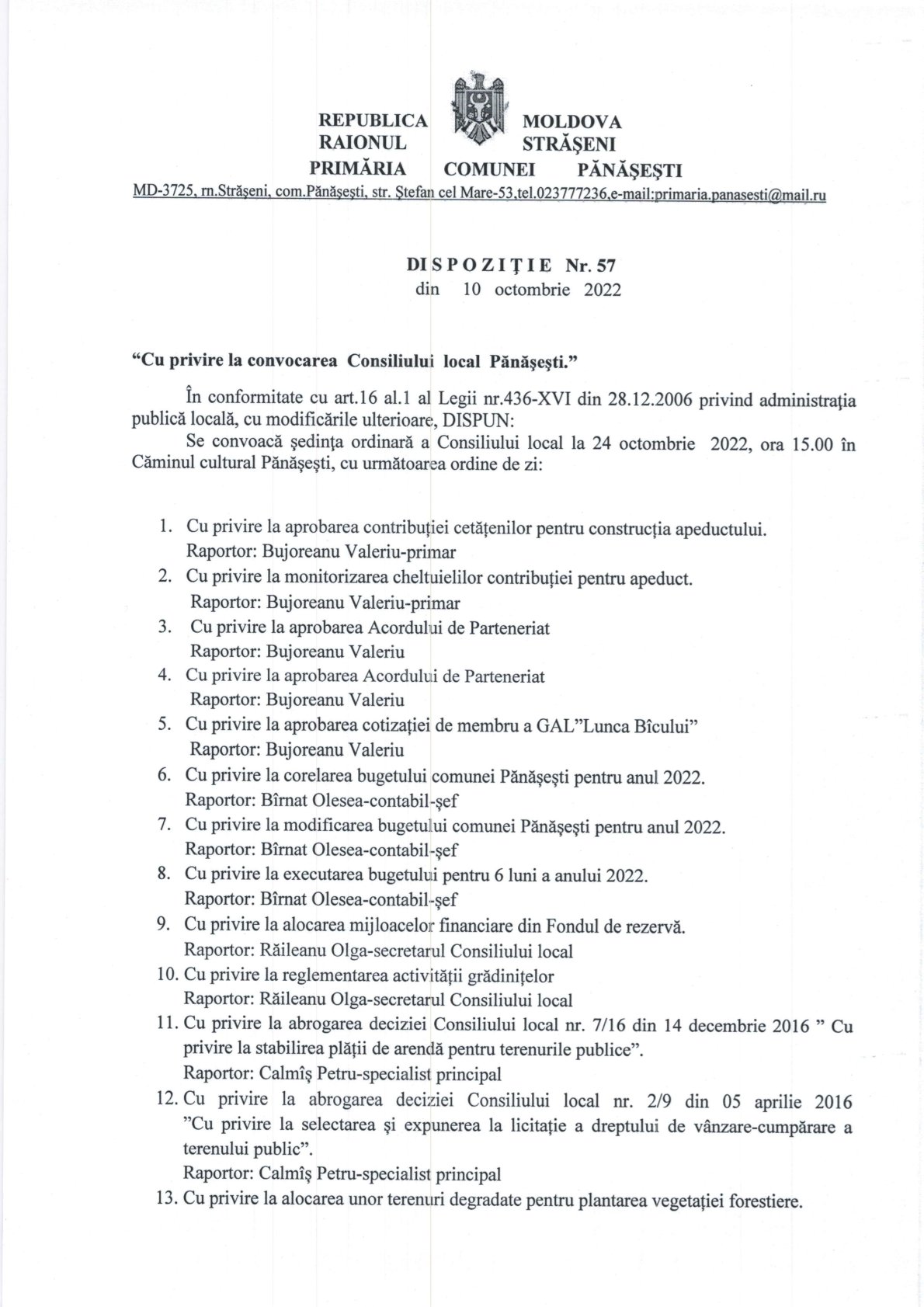 10 octombrie 2022 Dispozitia nr.57 din 10.10.2022 ,,Cu privire la convocarea Consiliului local Panasesti ” dispozitie