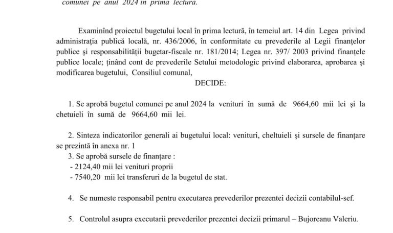 Cu privire la aprobarea bugetului comunei pe anul 2024 în prima lectură. 22 noiembrie 2023Primăria PănășeștiComments (0) De aprobarea buget 2024 lectura 1