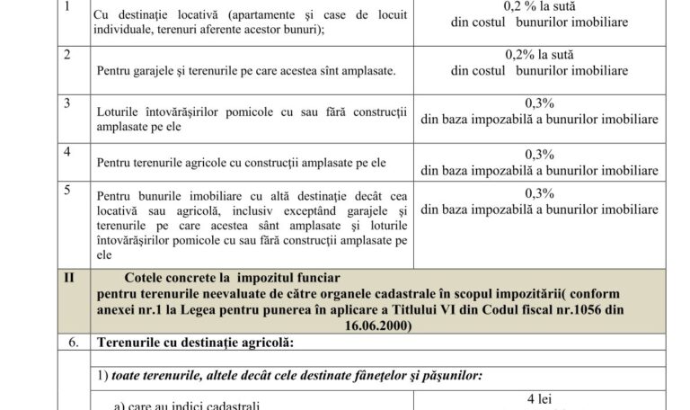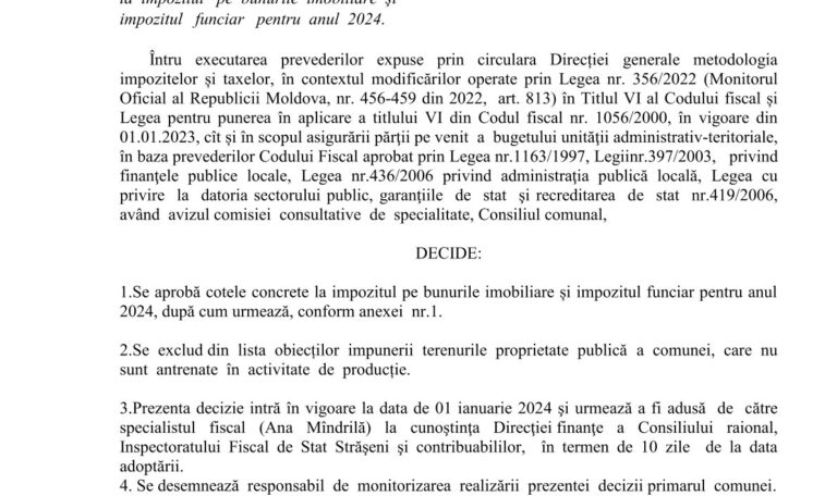 Cu privire la aprobarea cotelor concrete la impozitul pe bunurile imobiliare şi impozitul funciar pentru anul 2024. 22 noiembrie 2023Primăria PănășeștiComments (0) Cu privire la aprobarea cotelor concrete